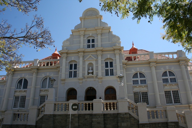 The building of the town hall commenced on 30 April 1910 and was completed on 1 May 1911. This red brick Renaissance style building makes a direct contrast with the Gothic style of the fourth Dutch Reformed Church that stands immediately in front of it.