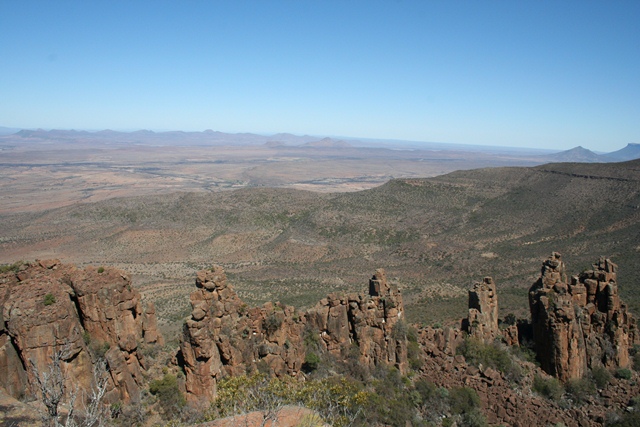 The columns of Dolerite rise 120 meters from the valley floor and in the distance the Karoo landscape stretches to the horizon.